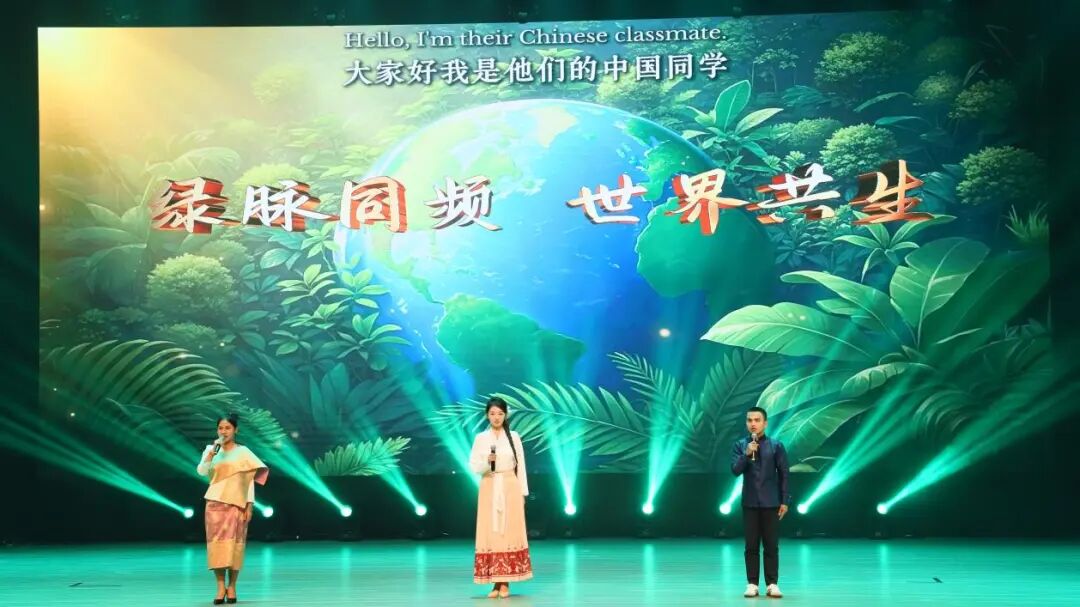 云南林业职业技术学院中老学生用《绿脉同频 世界共生》朗诵串联不同地域的环保实践,传递“人类共护地球家园”的使命。