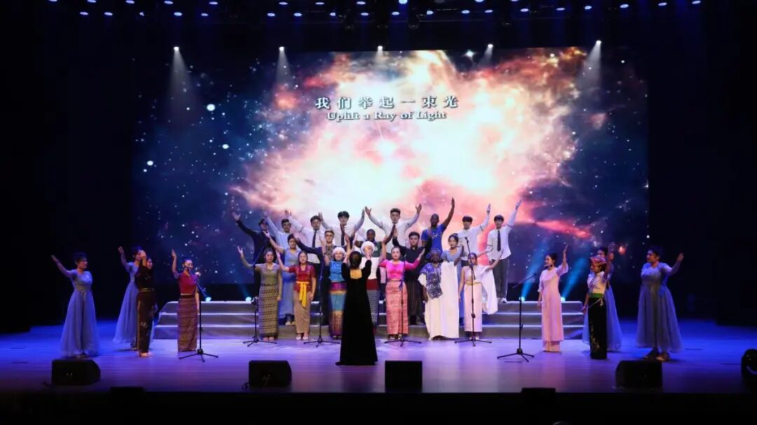 晚会在云南师范大学中外学子合唱《我们举起一束光》中拉开序幕,多国语言交织的歌声传递出“天下和顺”的共同愿景。