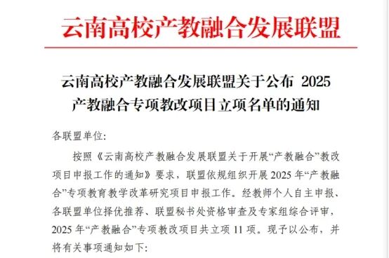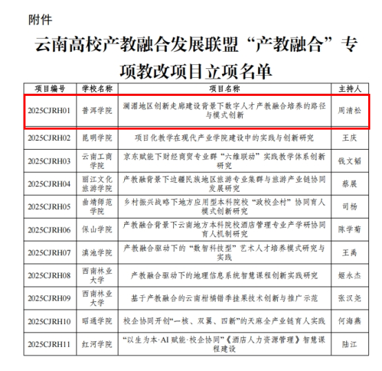 近日,云南高校产教融合发展联盟正式公布《2025年产教融合专项教改项目立项名单》,普洱学院申报的项目《澜湄地区创新走廊建设背景下数字人才产数融合培养的路径与模式创新》(项目编号:2025CJRH01)凭借鲜明的特色、扎实的研究基础与深远的应用价值,经自主申报、单位推荐、资格审查及专家组综合评审等多环节严格遴选,成功获批立项,这是学校在产教融合教育教学改革领域取得的又一重要突破。