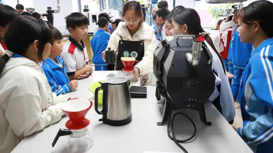 在咖啡冲泡体验区,来自茶叶咖啡学院的师生们与六顺学区的中小学代表展开了频繁而愉快的互动,大家通过亲手操作咖啡冲泡设备,深入体验从咖啡豆到一杯美味咖啡的全过程。这种互动不仅有效传播了丰富的咖啡文化知识,还为地方咖啡产业的未来发展培育了更多潜在的后备力量,充分体现了学校服务地方、回馈社会的责任与担当。